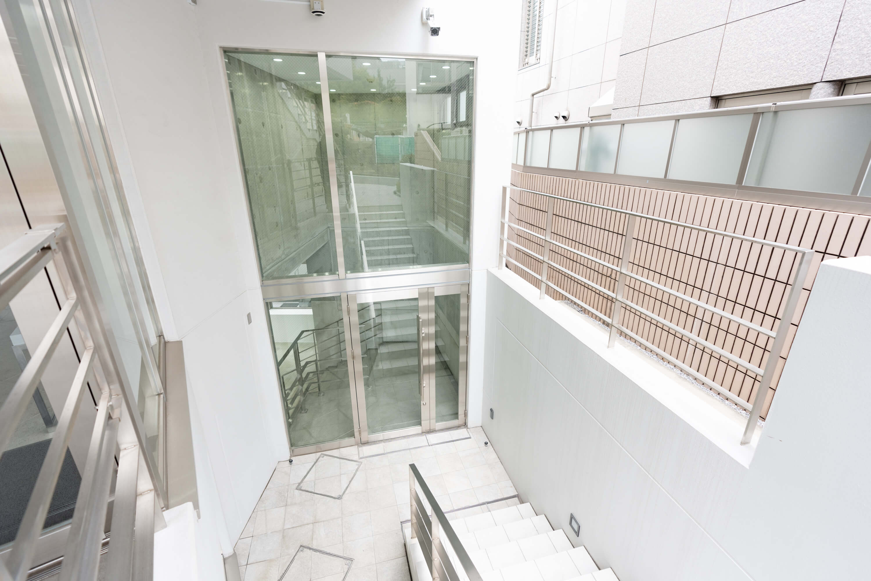 表参道並木通りから徒歩1分、メインストリートから一本入った落ち着いた立地に佇むギャラリースペース「KYO OMOTESANDO」。地下にありながら、天井高約4.7mの開放的な専用エントランスと、大きなガラスから柔らかな光が差し込む印象的な空間です。白壁と躯体現しのコンクリートがつくるミニマルな内観が、作品やプロダクトの存在感を際立たせます。都会の中心にありながら、静けさと光が調和する特別な時間を提供します。